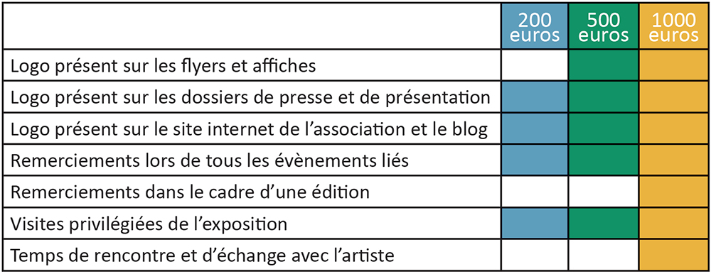 Selon le montant de votre don, le logo de votre entreprise sera présent sur les documents édités Le nom de votre entreprise sera cité lors des évènements liés au projet : expositions, rencontres publiques.