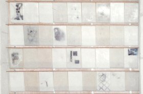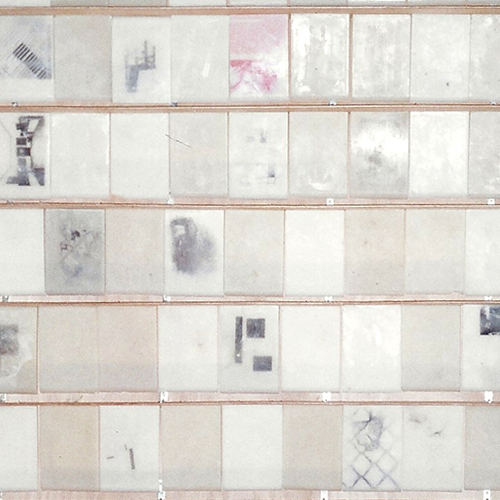 – Une œuvre sans titre (étagère) : Sur des plaques de cire apparaissent, disparaissent des images immergées (dans la cire), disparues, mais pas oubliées.